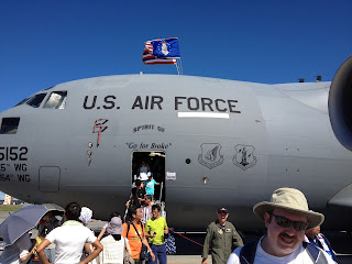 This is from inside one of the big American planes. Can you see the line formed on the left? That's to get inside the cockpit. It was a wait of a couple of hours; we were not interested. To the right you can see another line; that's for the cockpit of the other big American plane.